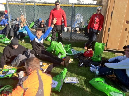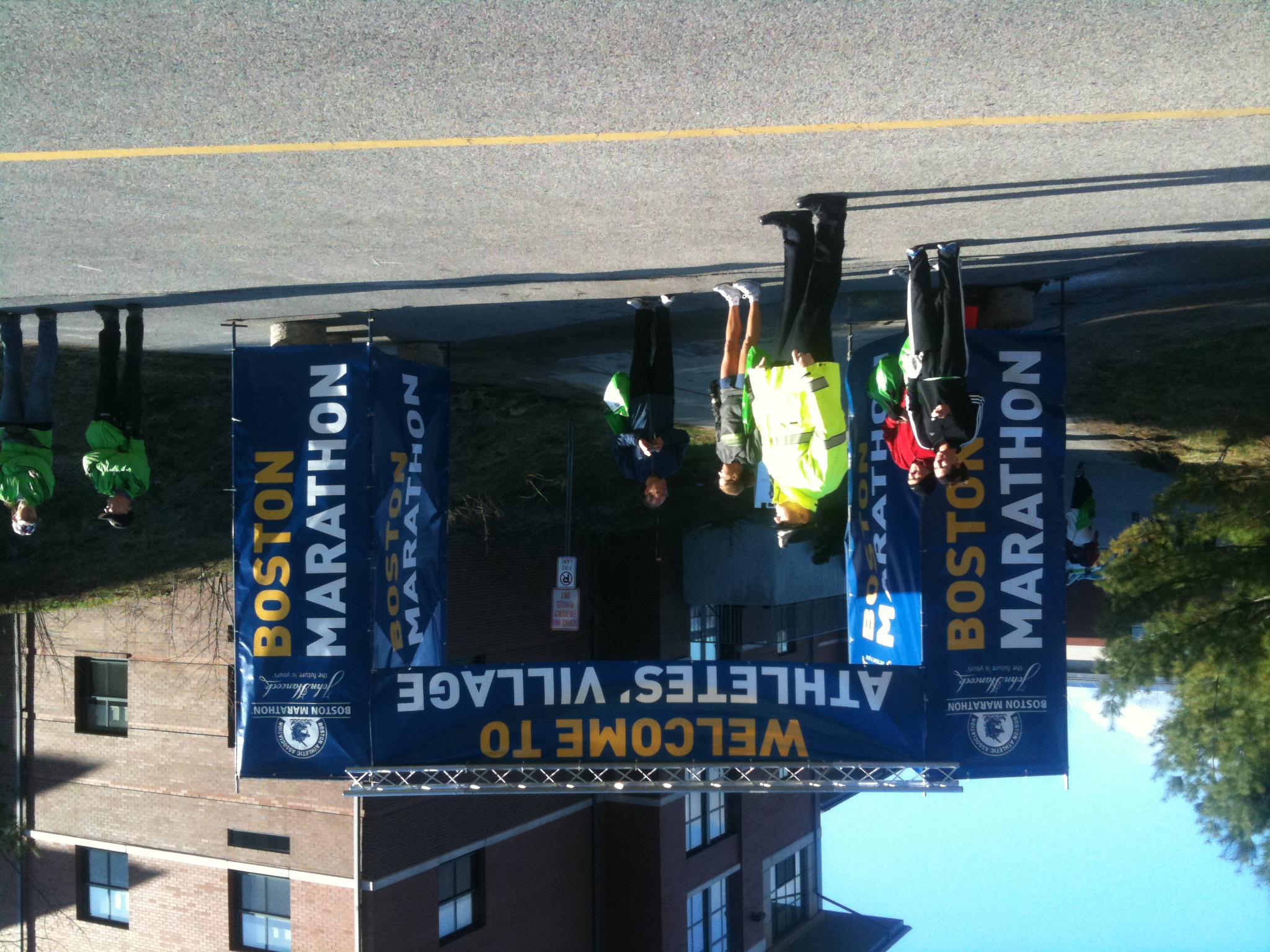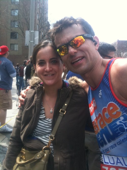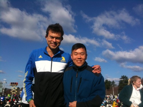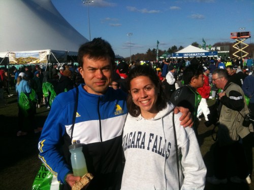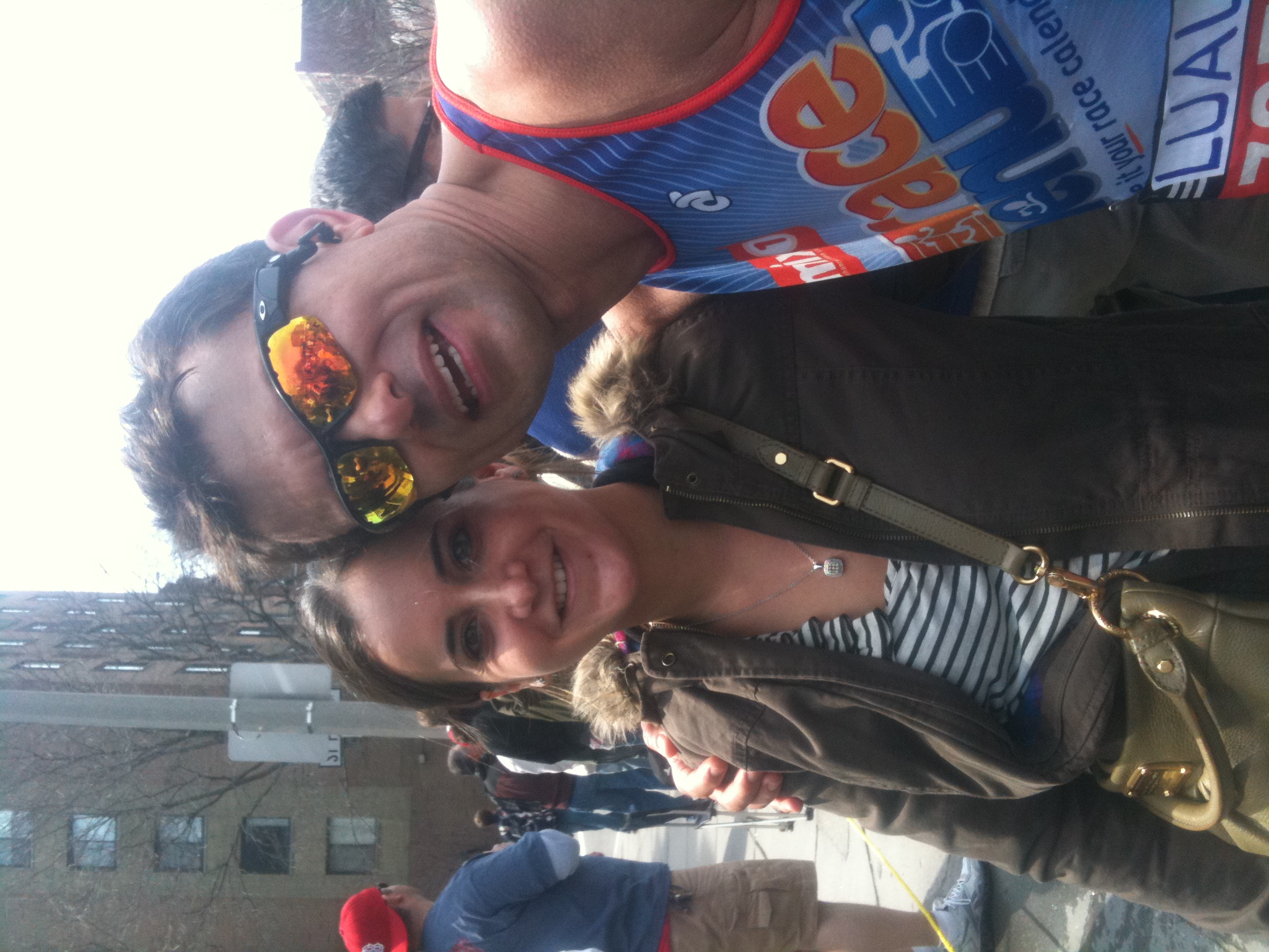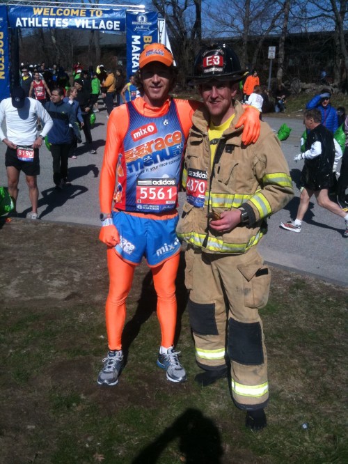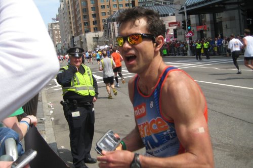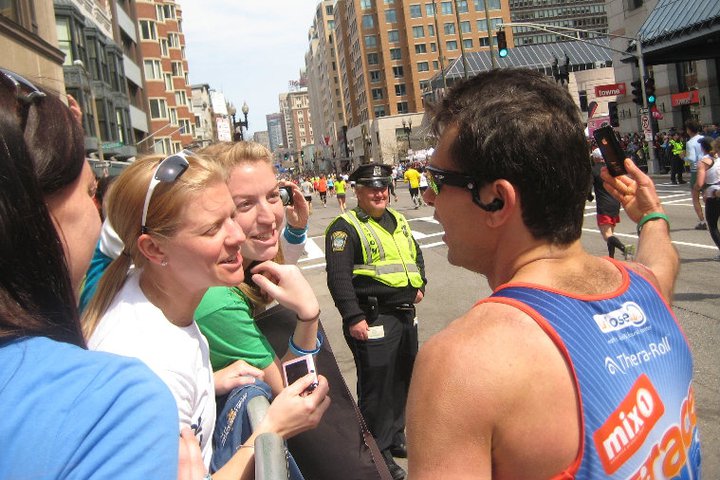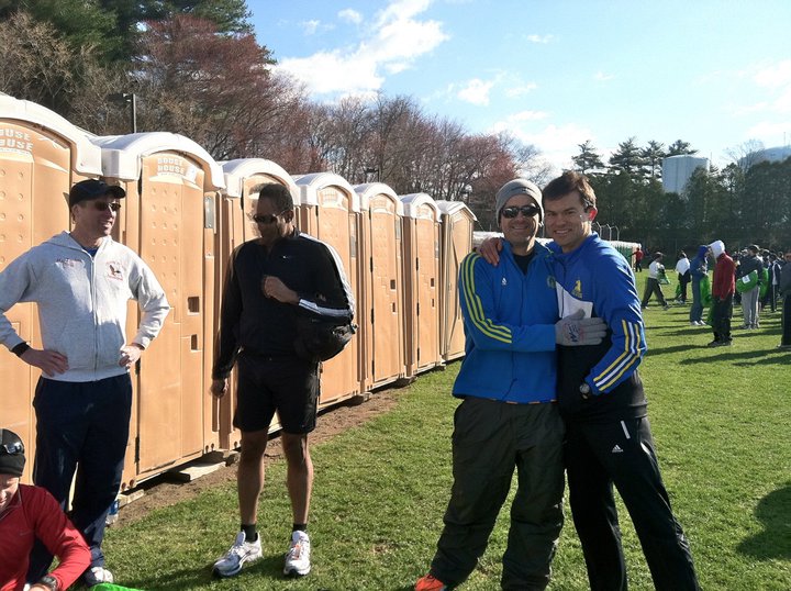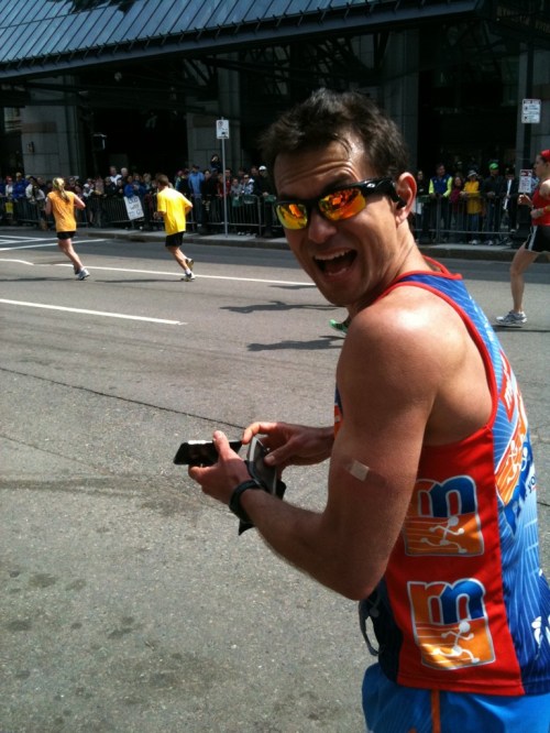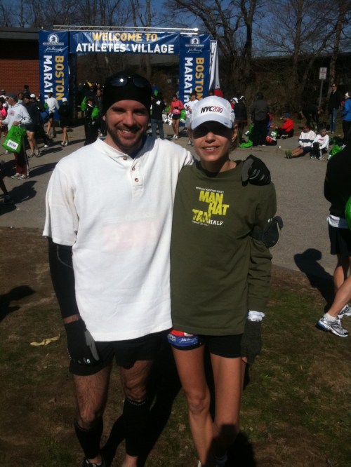 Yes, everything was lining up for an A+ effort on Monday. 3:10 was a real possibility, with a 3:15 all but in the bag! Though my morning was a bundle of nervous energy, I did manage to stay relatively relaxed on the surface. I found my dailymile friends in the Athletes’ Village, and the group of us kept each other loose with small talk and funny stories.