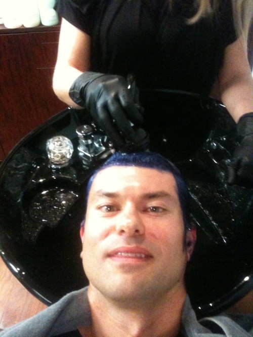 Anyway, that is how I ended up at Stilisti Boston yesterday. It was quite the ride. Marisa, the owner of Stilisti Boston and one of the top stylist anywhere, was kind enough to donate the job for the cause. Thank you Marisa (and the rest of your staff). You. Are. Amazing. They made me feel right at home – actually, they kinda made me feel like a celebrity. You will notice in some of the pictures the group of beautiful women surrounding me. No, it’s not because of my dashing good looks or the curiosity of a suburban dad dyeing his hair blue. No, it is because these women were there to learn from the best in the business (Marisa, not me). You can find Stilisti Boston at http://stilistiboston.com/ on the Interwebs or 138 Newbury Street, 2nd Floor in Boston – 617-262-2234. I’d also appreciate it if you’d consider following them on Twitter at @stilistiboston.